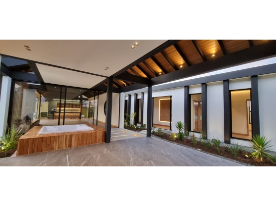 • Amplio deck cubierto con zona de BBQ, Salón-Bar, chimenea y jacuzzi.