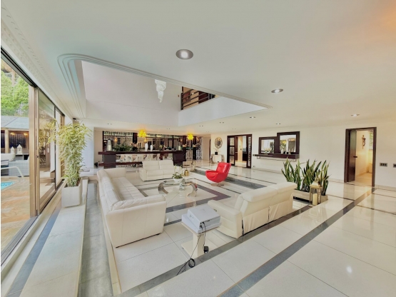 La zona social del apartamento es extremadamente generosa, con sala doble altura, con salida a la piscina, kiosco, comedor, y un bar con su bodega
