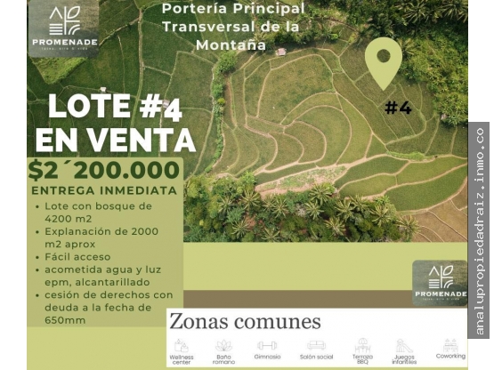 Lote en Promenade de lote con bosque de 4.200 Metros cuadrado y explanación de 2000 metros cuadrados aproximadamente con excelente índice habitacional, que permite construir la casa con huella de 350 a 800m2 en primer nivel y con posibilidad de construir hasta el 60% en el segundo nivel. Un espacio para respirar aire puro y vivir en equilibrio con nuestro entorno. Espacios que te ofrecen abundante naturaleza y paisajes maravillosos .ademas cuenta con fácil acceso , acometida agua y luz epm , alcantarillado.